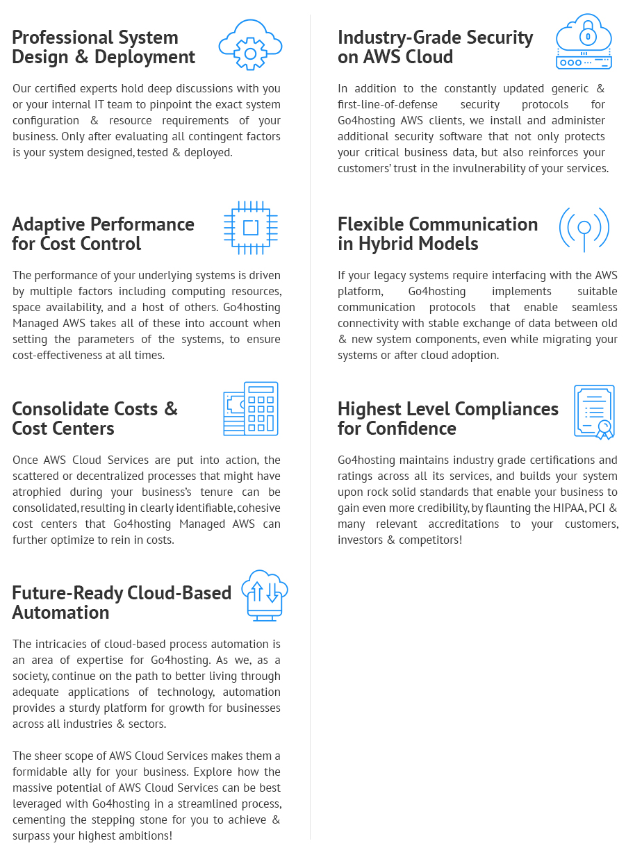 Go4hosting makes sure that the functioning of AWS Lambda remains top-notch, tweaking it to your unique business needs, in line with the sector or industry in which you conduct your business.